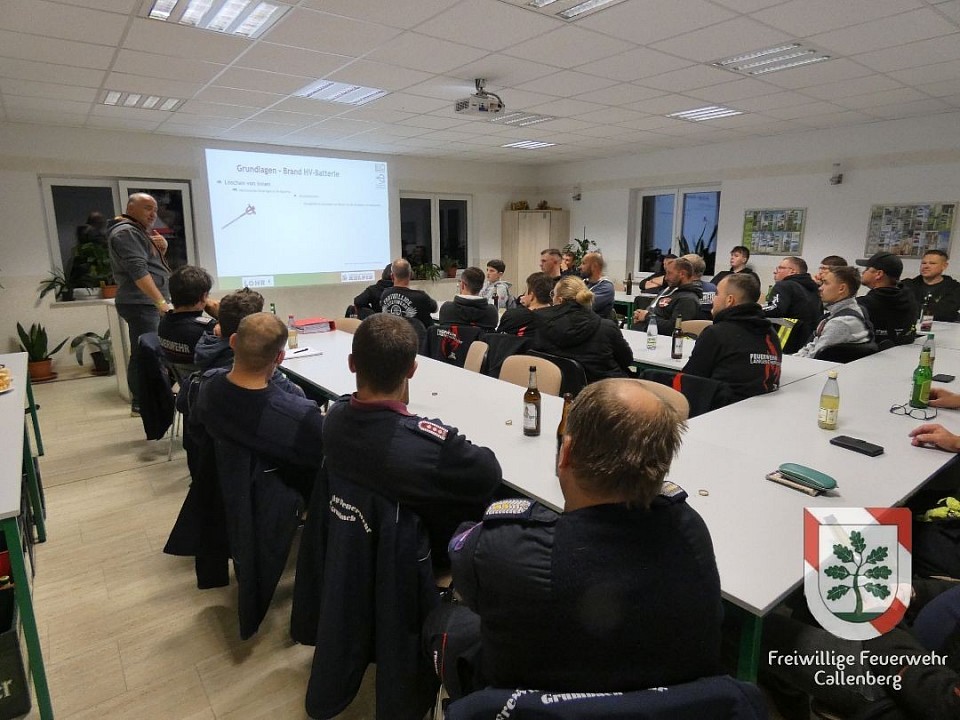 Gegen 19 Uhr begrüßte unser Gemeindewehrleiter die anwesenden Kameradinnen und Kameraden. Im Anschluss stellte sich der Technische Leiter der Firma Umweltservice Lohr vor und vermittelte interessante Einblicke in das Verhalten von brennenden oder verunfallten Elektrofahrzeugen. Dabei wurde insbesondere besprochen, wie Einsatzkräfte der Freiwilligen Feuerwehr bei solchen Einsätzen sicher und effektiv vorgehen können.