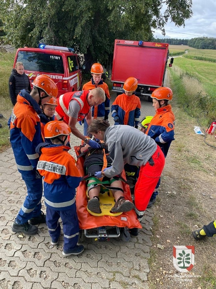 Wie bei der Berufsfeuerwehr begann der Samstag früh: 6:00 Uhr Wecken, 7:00 Uhr Fahrzeug und Dienstübernahme. Nach dem Frühstück folgte der erste Alarm: Verkehrsunfall mit verletzter Person. Die Jugendlichen übernahmen Betreuung, Absicherung und stellten die Löschbereitschaft sicher. Im Laufe des Vormittags folgten weitere Einsatzszenarien wie ein Mülleimerbrand, eine Katze auf dem Baum und eine Ausbildung zur Wasserrettung am Stausee Oberwald, bei der mithilfe eines Schlauchbootes eine zu ertrinken drohende Puppe gerettet werden musste. Als alle drei Einsatzgruppen gegen 12:00 Uhr zum Mittag ins Gerätehaus zurückgekehrten, schrillte erneut der Alarm: Brandmeldeanlage an der Grundschule Langenberg ausgelöst, glücklicherweise ein Fehlalarm. Umso besser, denn in der Sommerküche wartete bereits das Mittagessen und unsere kleinen Einsatzkräfte konnten sich endlich stärken. Kaum war das Mittagessen verdaut, wurden wieder Einsätze wahrgenommen. Die Gruppen haben durchgetauscht, so dass jede Gruppe alle Einsatzszenarien einmal abarbeiten konnte. Als dann gegen 14:00 Uhr alle Fahrzeuge zurück von ihren Einsätzen gekommen waren, ertönte erneut der Vollalarm, diesmal ein bestätigter Brand: Mehrere Palettenstapel auf dem Gelände der Agrargenossenschaft in Brand geraten. So der Alarmtext der Leitstelle. Schon auf der Anfahrt stieg die Spannung, die Jugendlichen gaben sich gegenseitig Befehle und planten ihre Vorgehensweise. Nach Ankunft wurde zügig ein Löschangriff mit drei C-Hohlstrahlrohren aufgebaut. Das Feuer konnte rasch gelöscht und letzte Glutnester gezielt bekämpft werden.